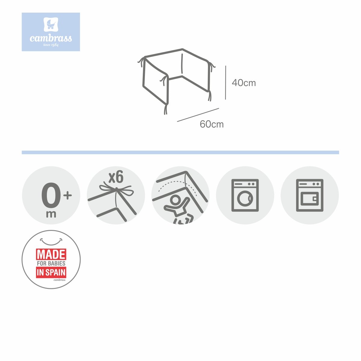 El Protector cuna acolchado de Cambrass, disponible para cunas de 60 cm., protege las barandillas de la cuna evitando posibles golpes del bebé. Fabricado en España. Por Cambrass.